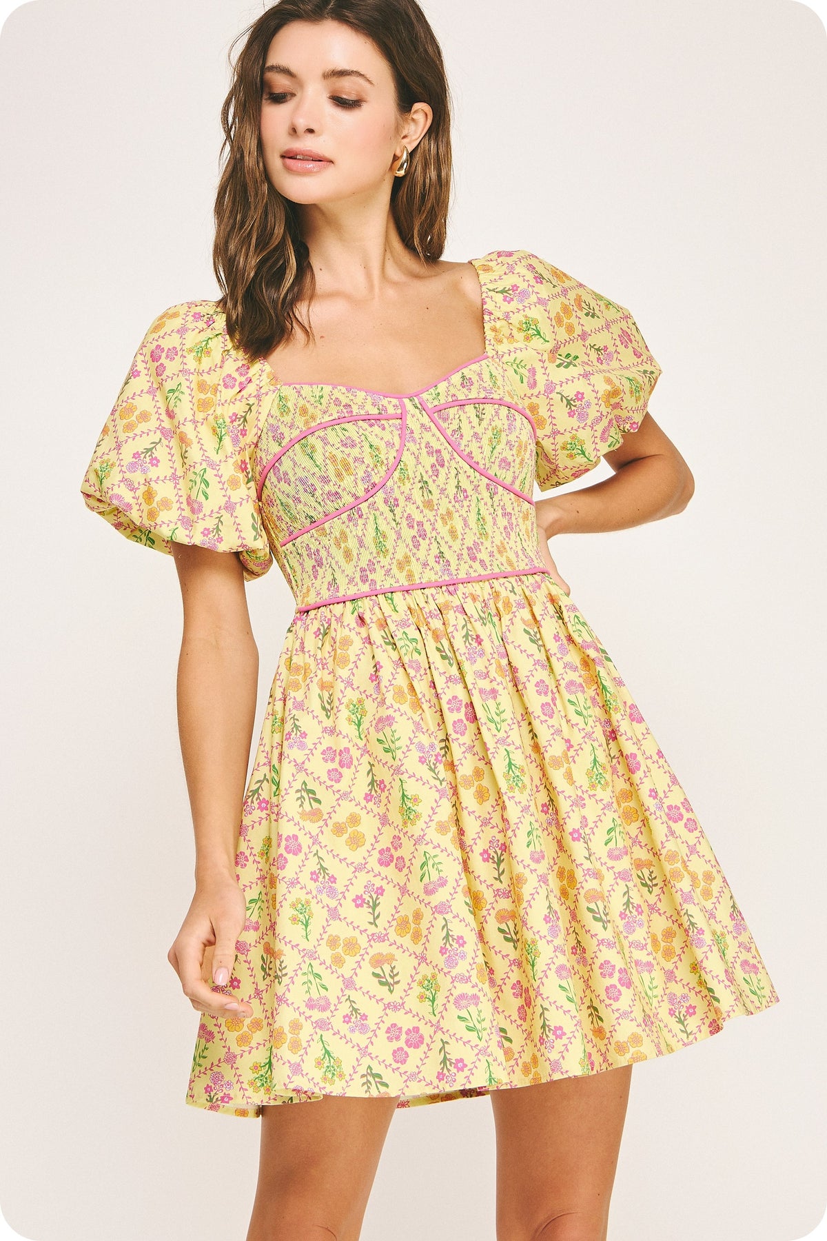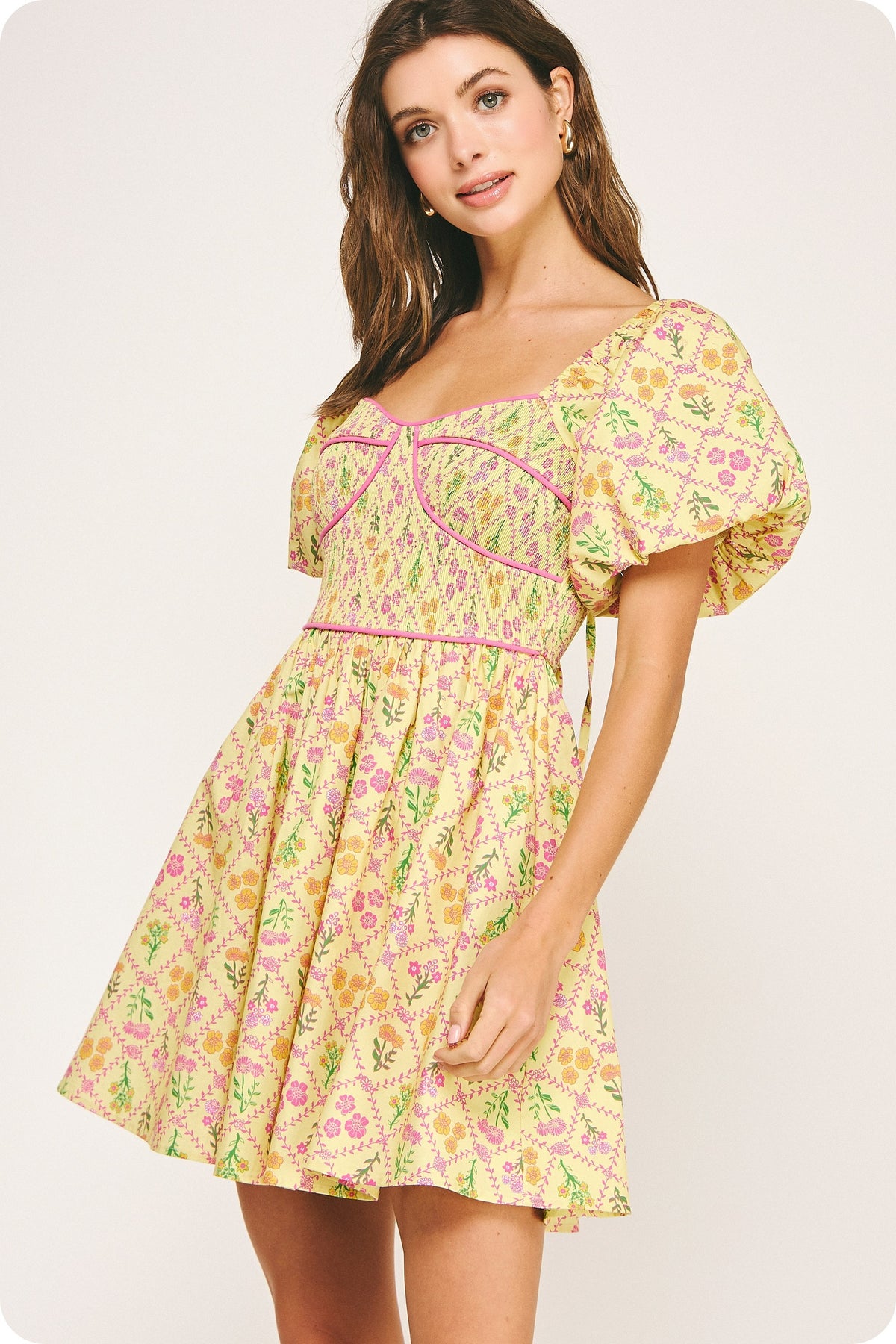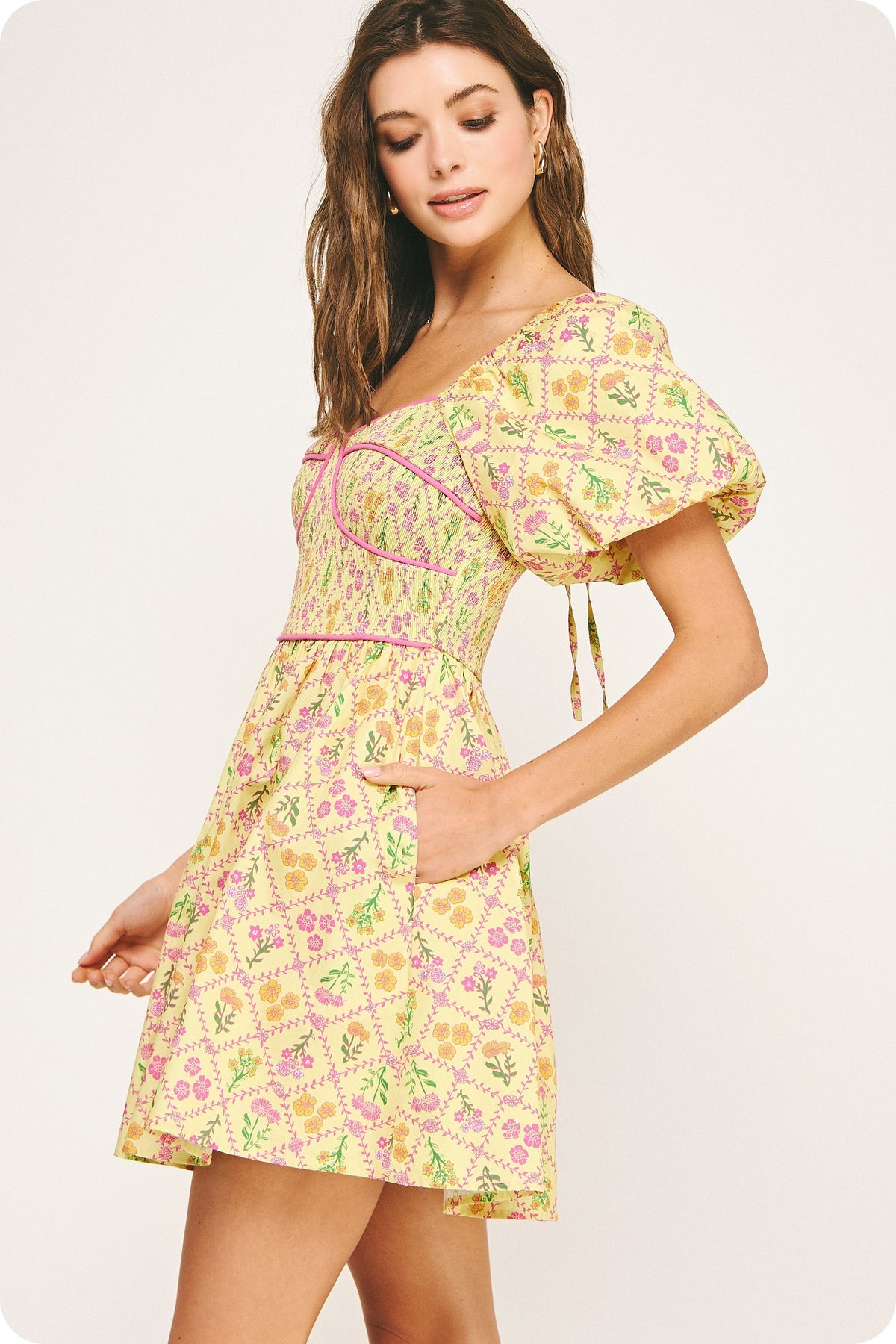 OBSSESSED! Our gorgeous Elizabeth Dress features a quirky floral print, contrasting pink piping and puffy sleeves. Wide scoop neckline. Square back with adjustable tie. Hidden back zipper. Two pockets at hips. Lined. Styled with our Colmar Sandal.