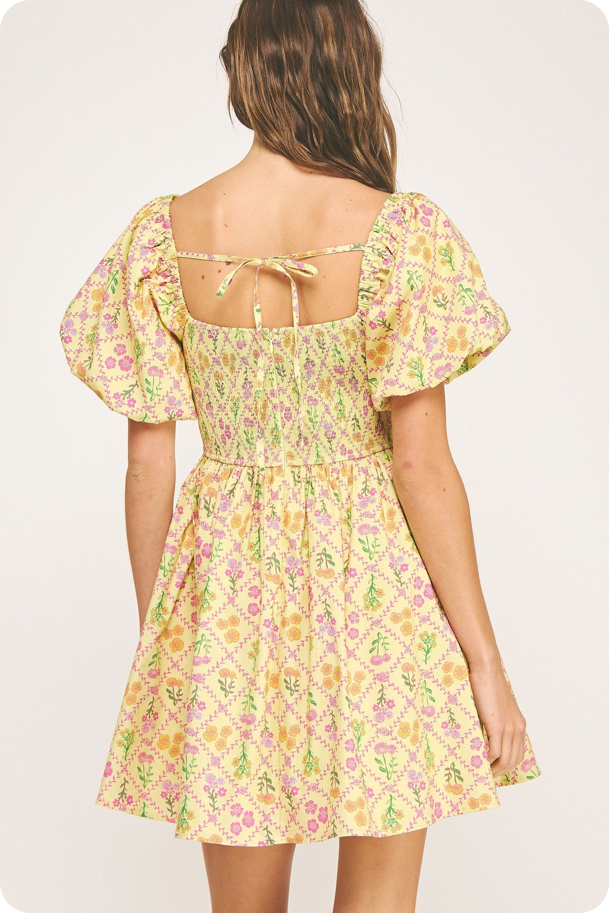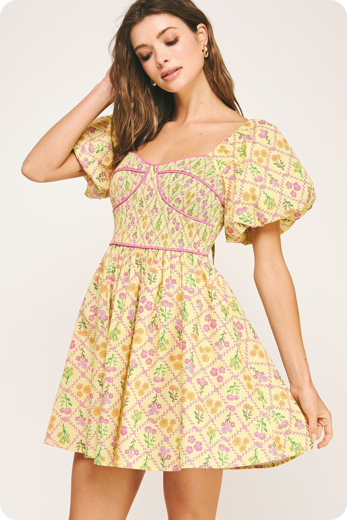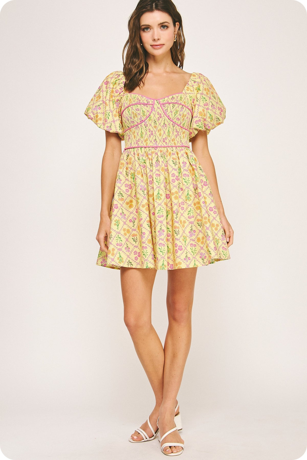 OBSSESSED! Our gorgeous Elizabeth Dress features a quirky floral print, contrasting pink piping and puffy sleeves. Wide scoop neckline. Square back with adjustable tie. Hidden back zipper. Two pockets at hips. Lined. Styled with our Colmar Sandal.