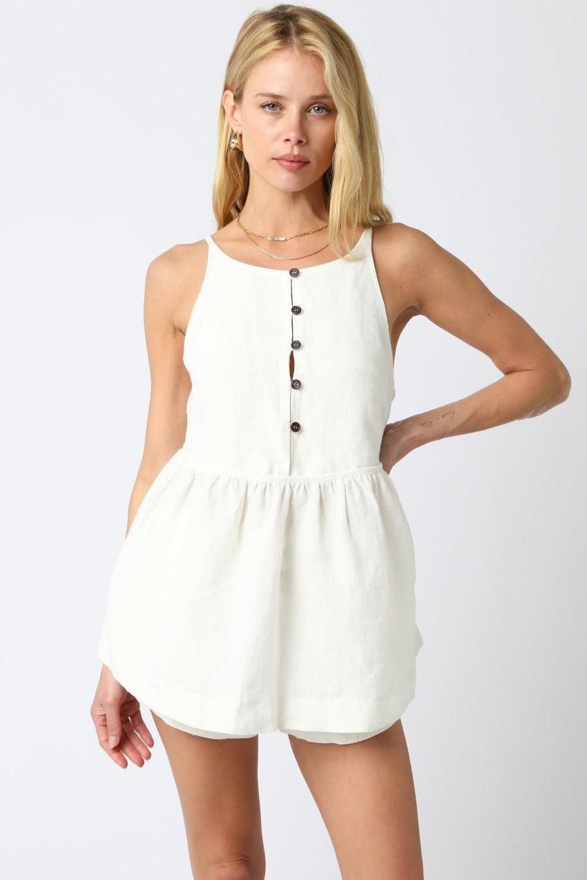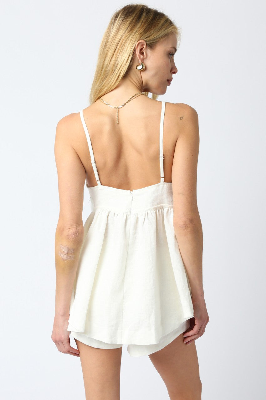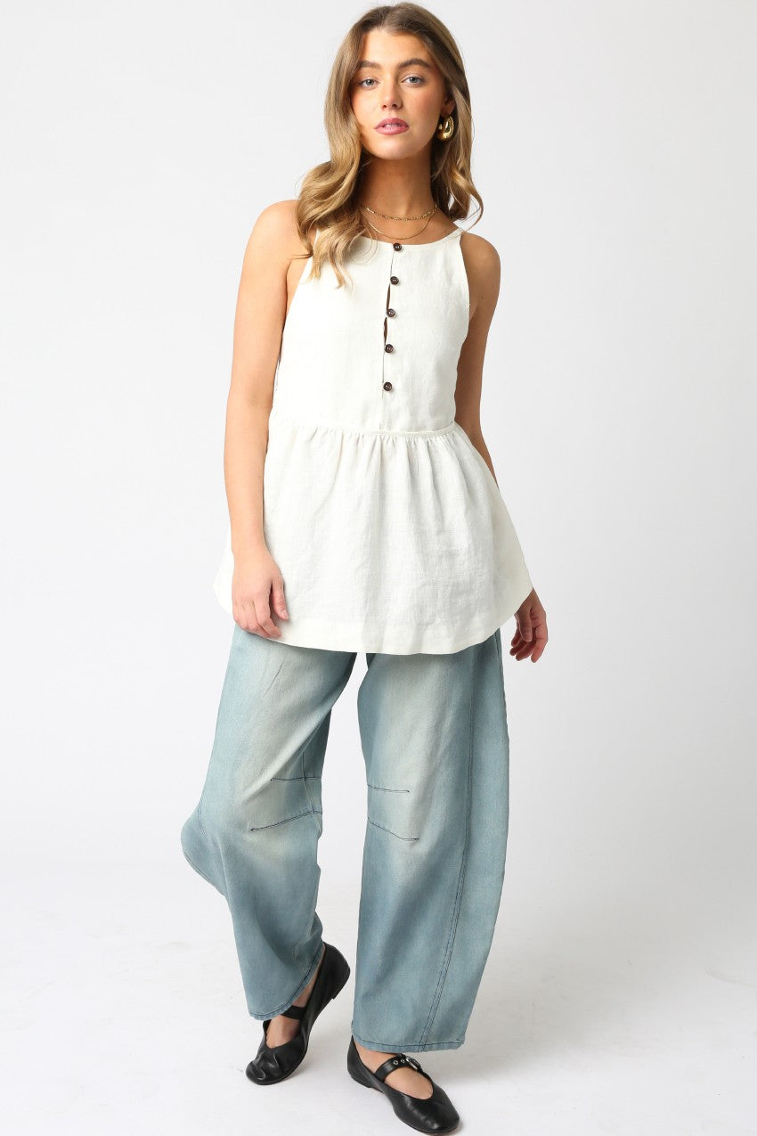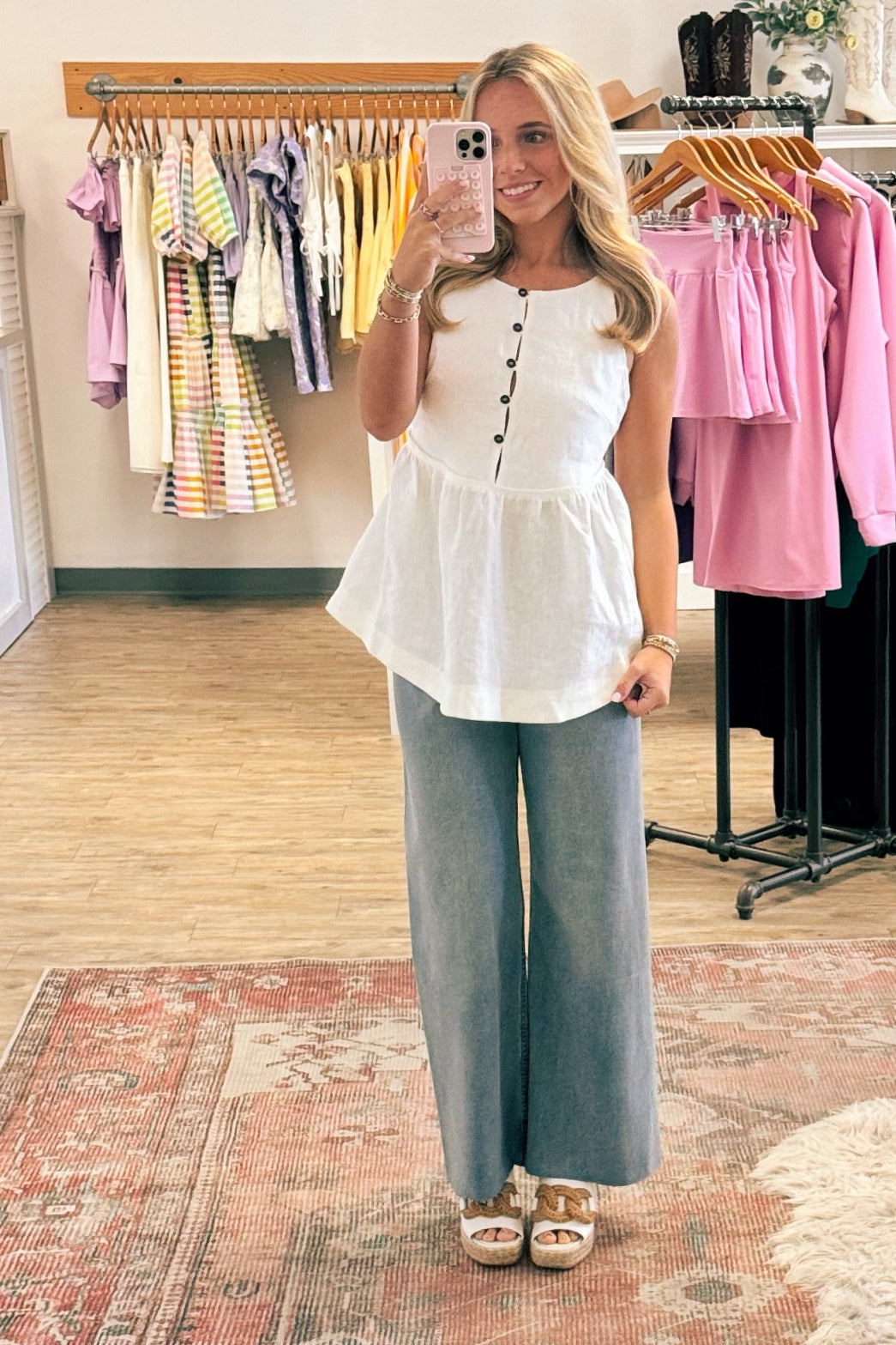 Linen top featuring a low, square back and full peplum waist. Buttons down the front. Easy fit. Styled with our Olivia Wide-Leg Jean and Aime Wedges.