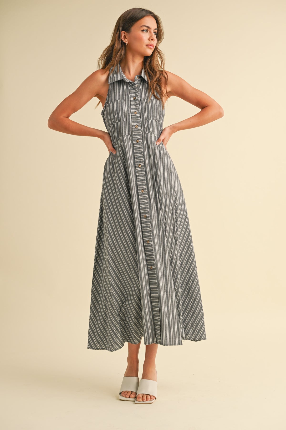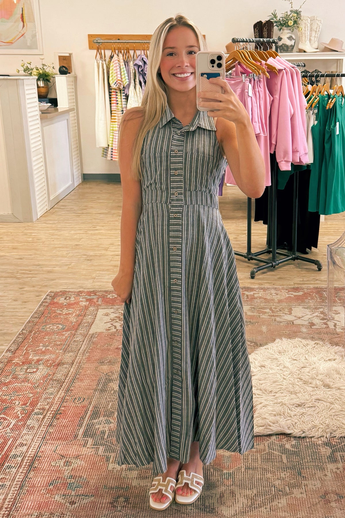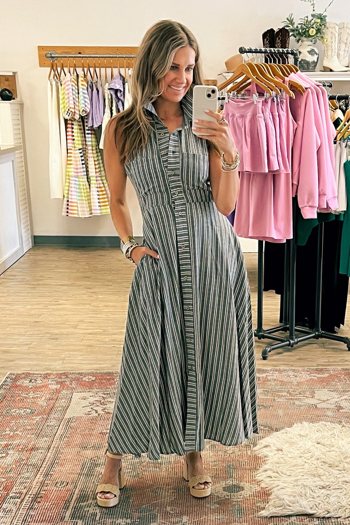 Our Iightweight, cotton-blend Isabel Dress features a shirt collar, nipped waist and buttons down the front. Two slip pockets at hips. Sleeveless. Unlined. Styled with our Snooze Raffia Heel (Laura) and Ena Slide (Madeline).