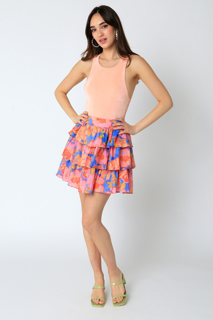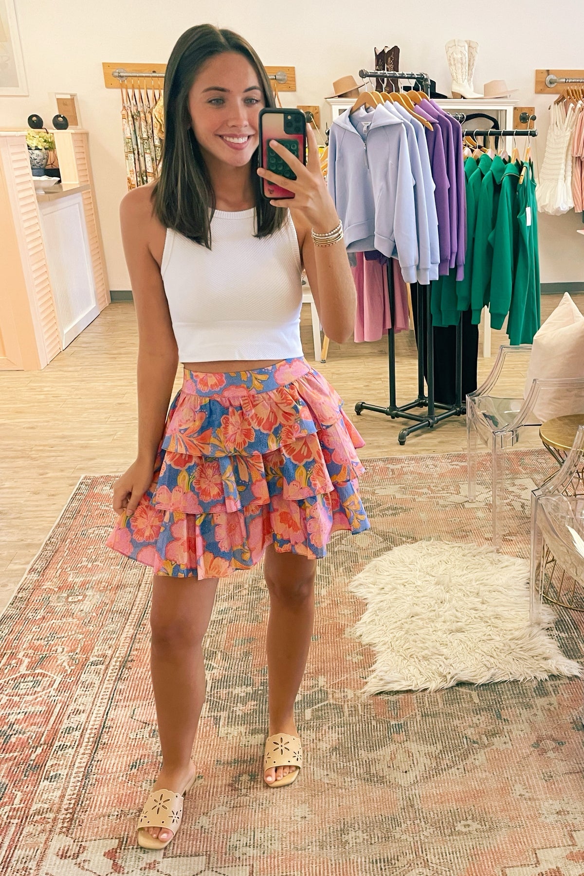 Our colorful Jessamine Skirt is perfect for sorority recruitment! Tiered ruffles. Hidden back zipper. Styled with our Chevron High-Neck Crop.