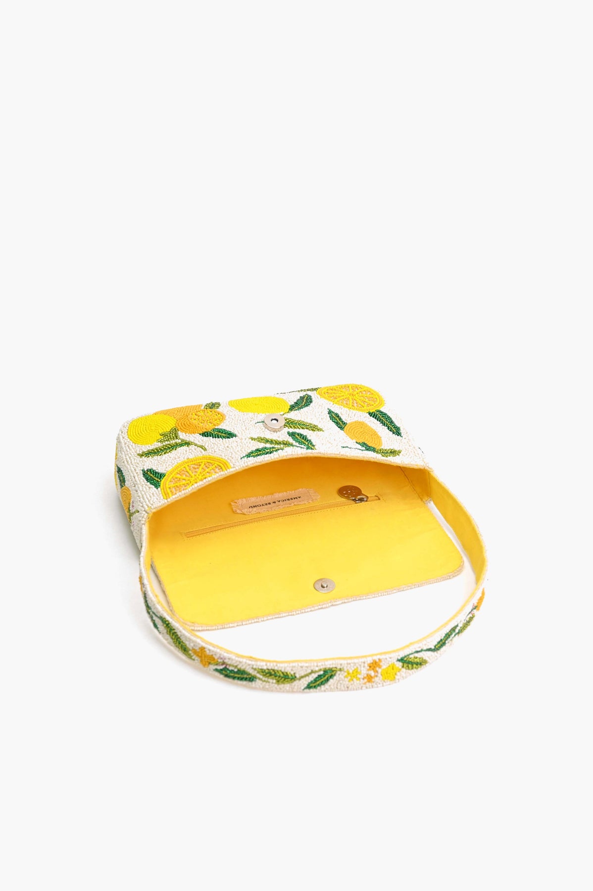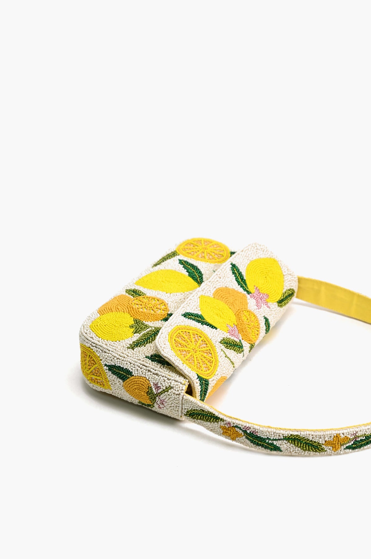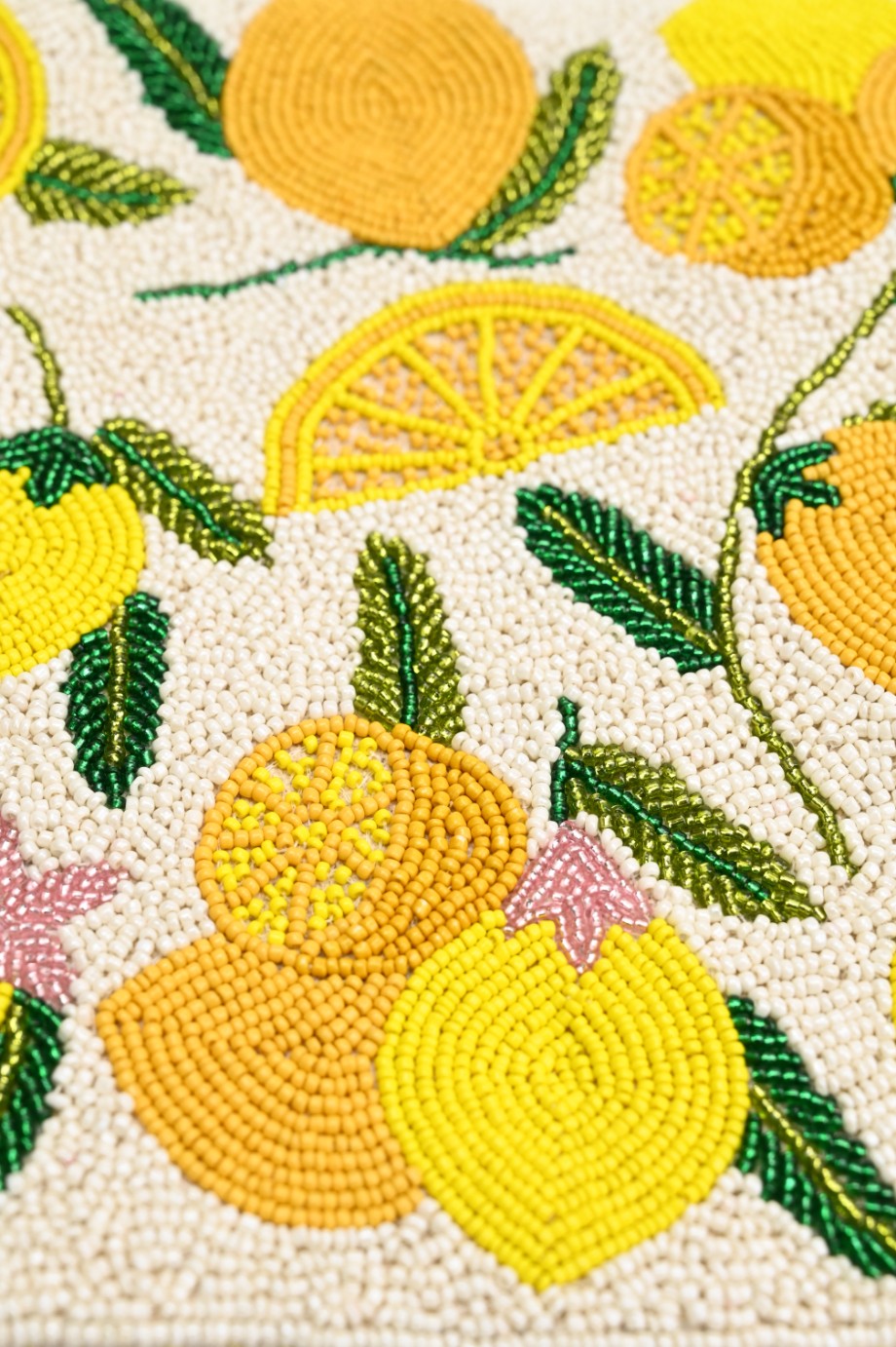 The ultimate it-girl bag! Our stunning Make Lemonade Beaded Bag can be worn with jeans and a t-shirt...or your fanciest black dress. Gorgeous beaded designs all over. One interior zipper pocket. Double magnetic closure. Beaded shoulder strap. Dust bag included.