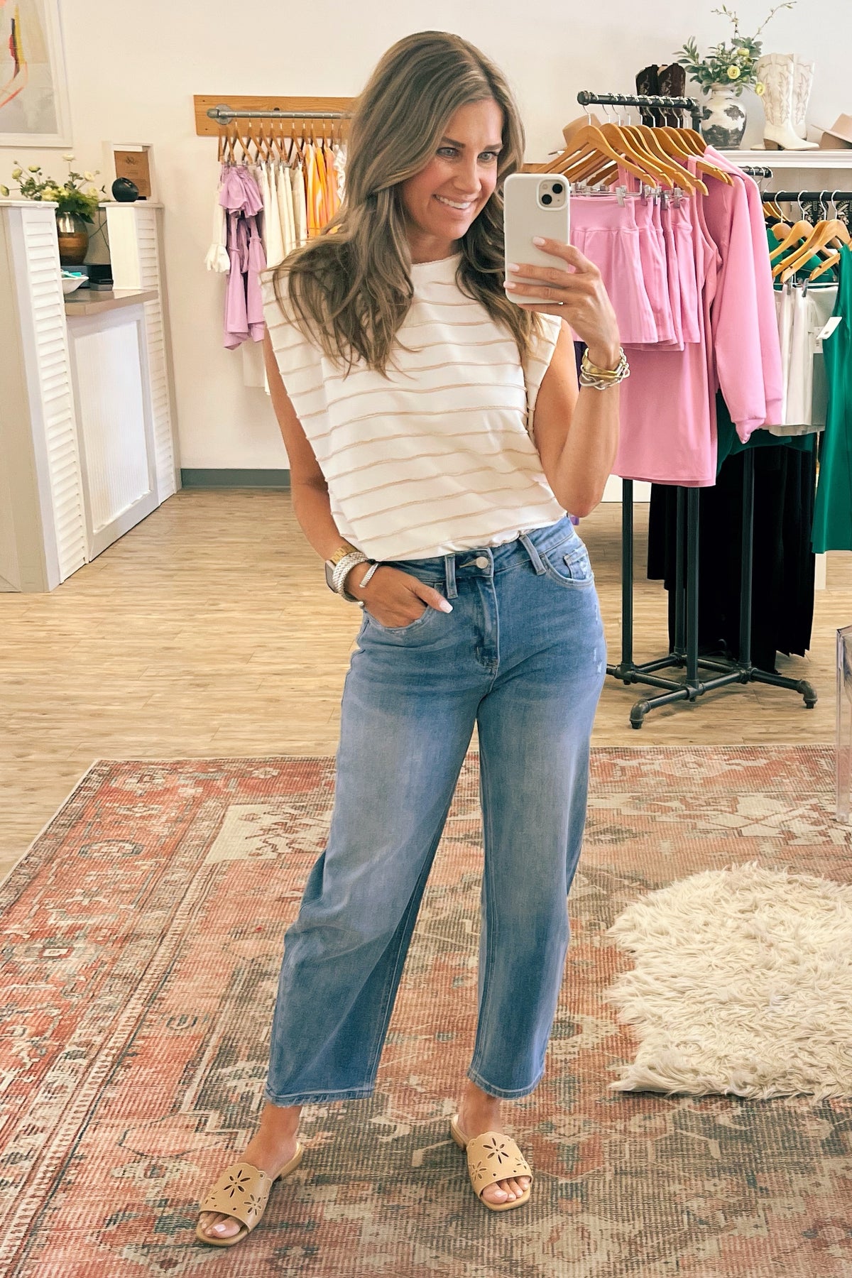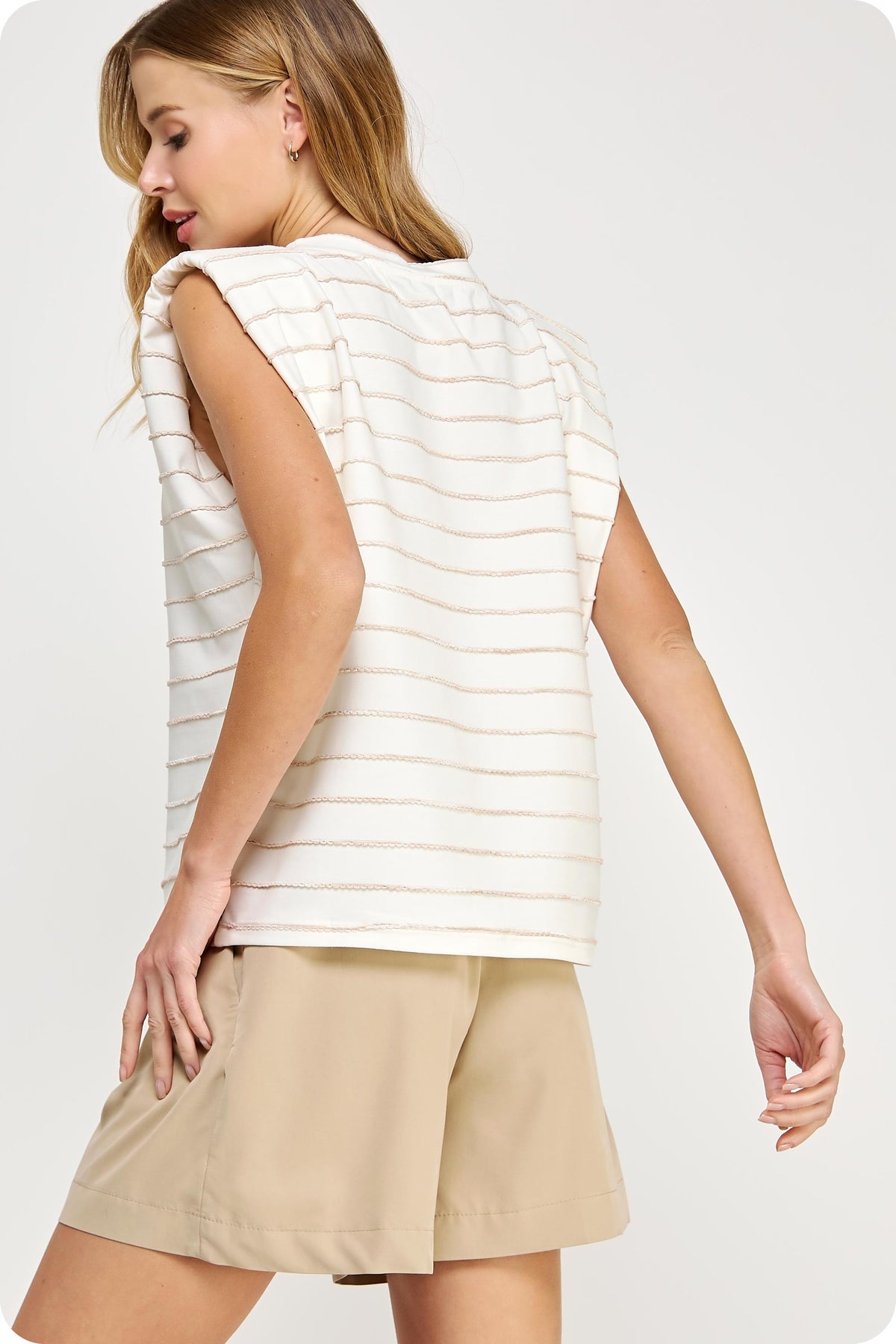 Relaxed-fit muscle tee with striped embroidery and shoulder pads. Slight stretch. Full length. Styled with our Attractive Barrel Jean and Manila Sandal.