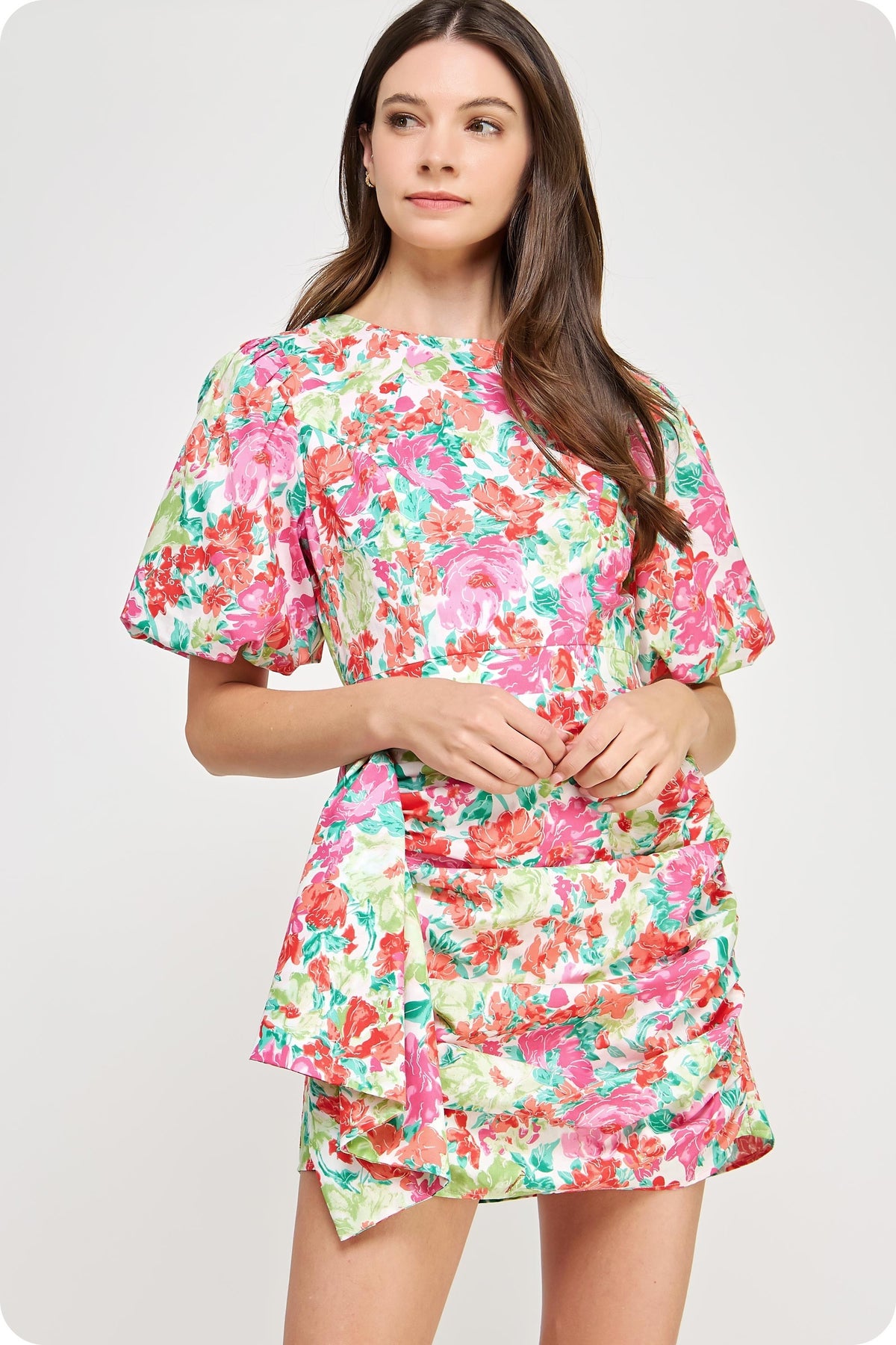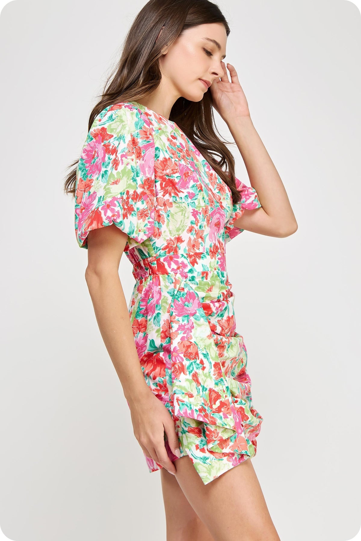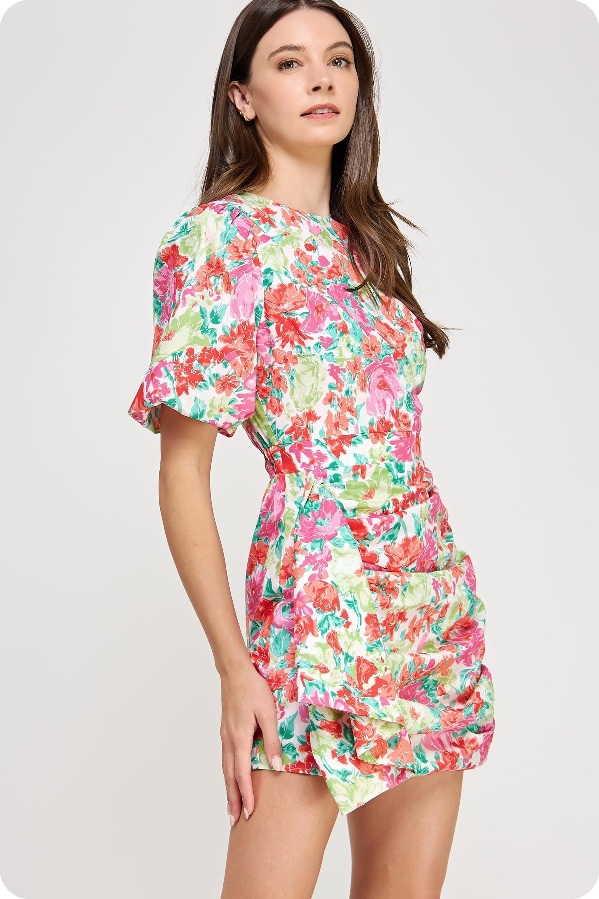 Multicolor ruched dress with puffy sleeves. Hidden back zipper. Lined. Styled with our Colmar Sandal. This dress runs a little small/short - if you are in between sizes, you may want to size up.