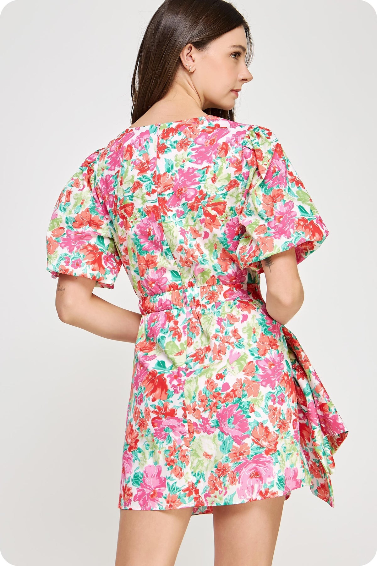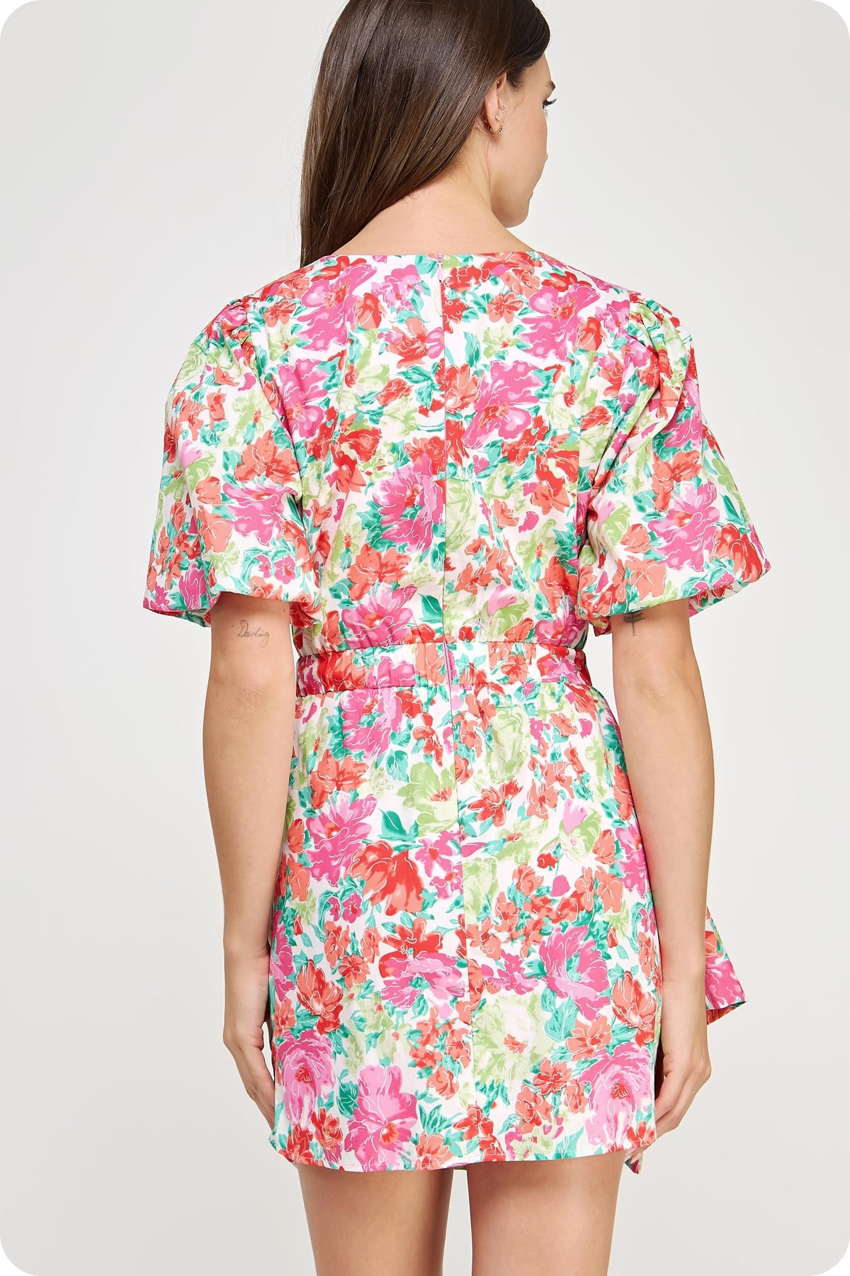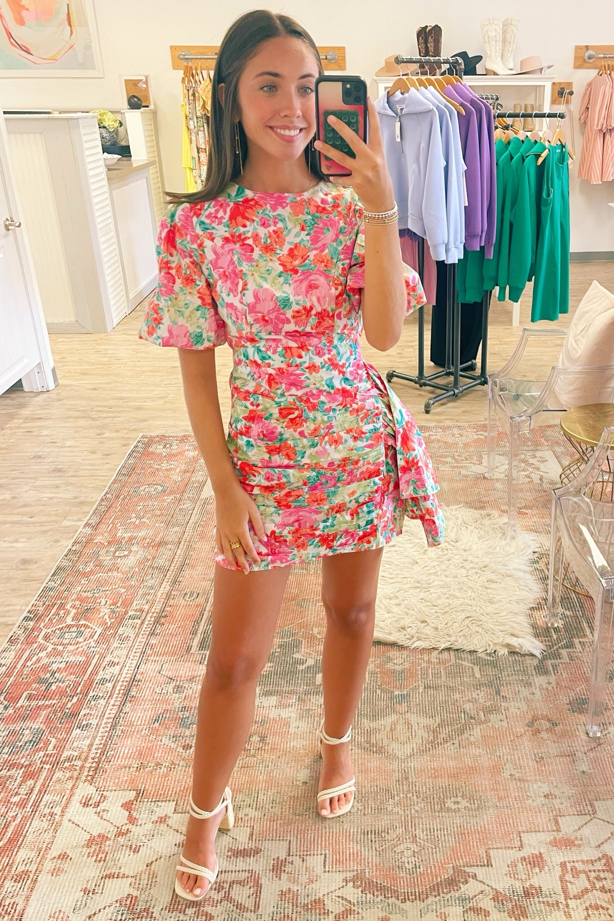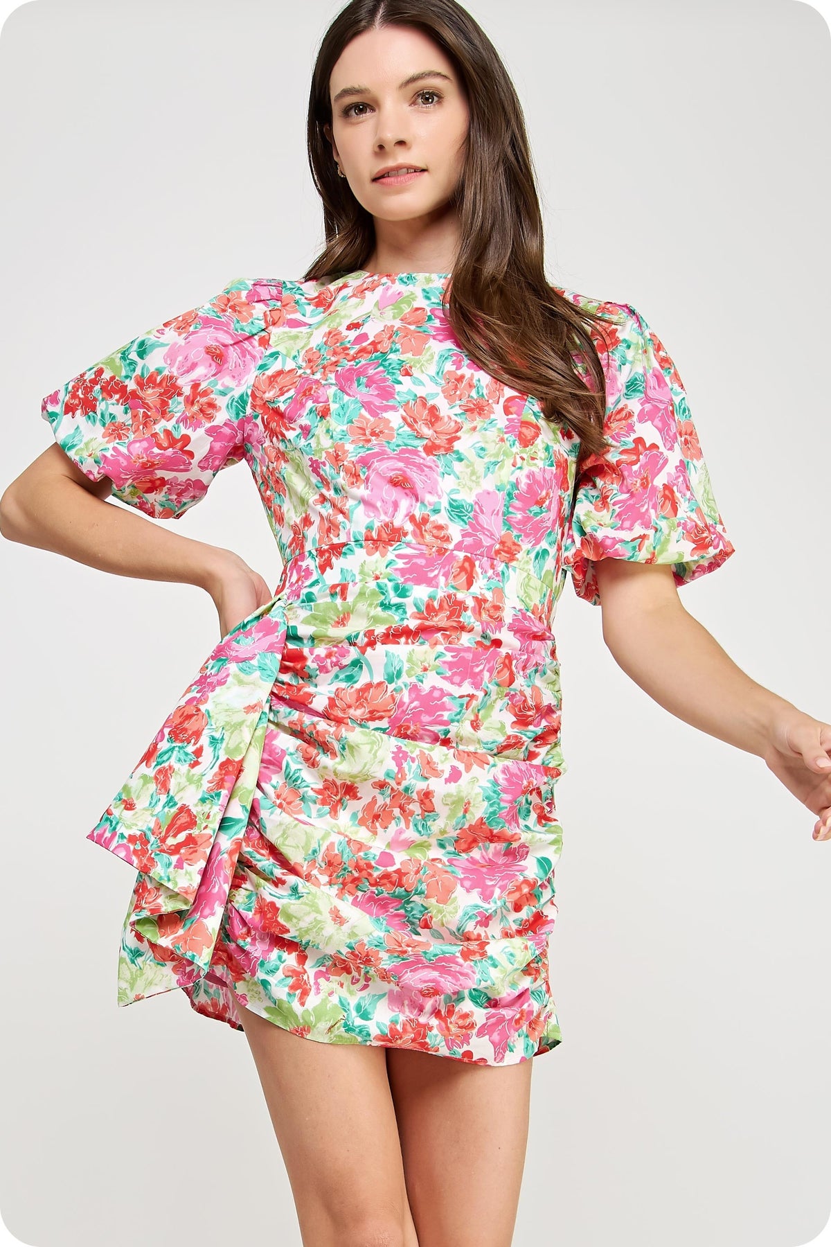 Multicolor ruched dress with puffy sleeves. Hidden back zipper. Lined. Styled with our Colmar Sandal. This dress runs a little small/short - if you are in between sizes, you may want to size up.