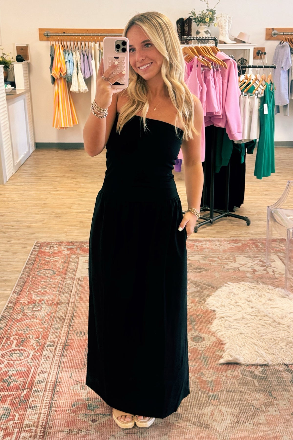 Our strapless Mindful Maxi Dress features a knit top and linen skirt. Slit in back. Two slip pockets at hips. Styled with our Raina Wedge.