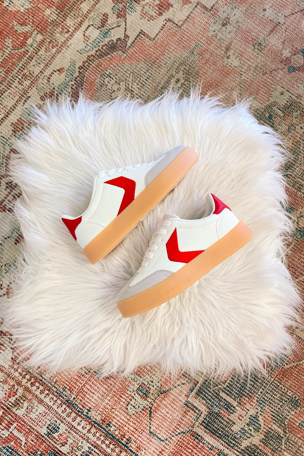 Sporty low-top sneaker featuring a grey suede accent at the toe, red corduroy arrow on the inside vamp and a matching red accent at heel. Synthetic leather and suede. Lace-up construction. Modest, comfy platform.