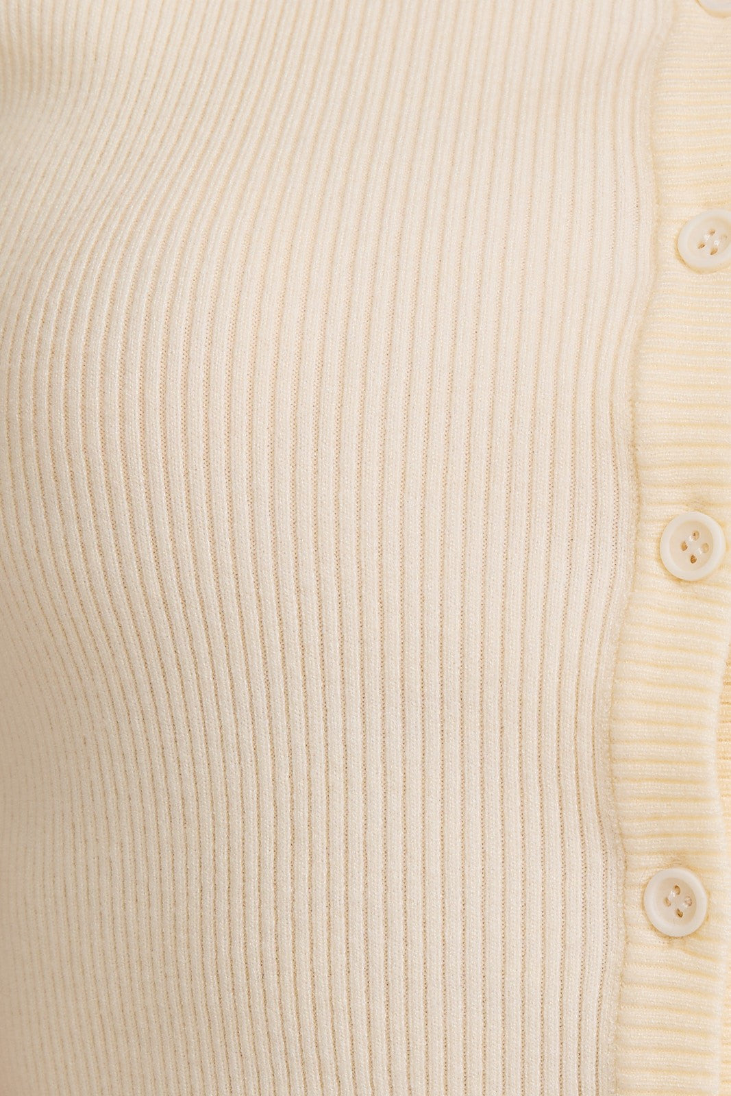 The perfect little top to wear with your favorite jeans. Our Presley Top features a crew neck, functional buttons down the front and thin ribbing. Slightly cropped length. Styled with our Attractive Barrel Jean and Poetry Sneaker.