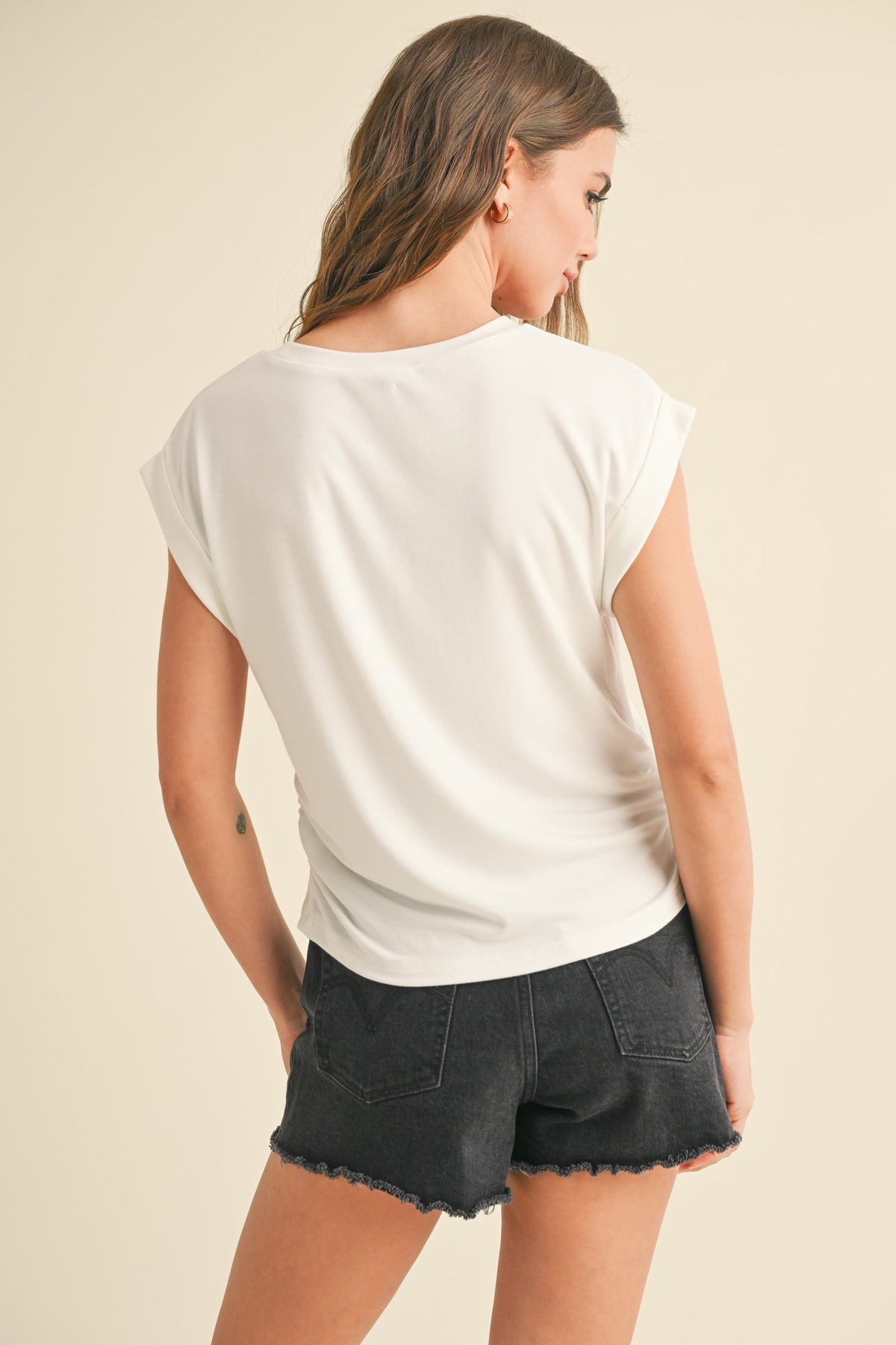 The softest tee you will EVER wear! Our Regan Top features cuffed sleeves and ruching at the sides. Styled with our Vanessa Denim Shorts and Vivian Loafer Slides.