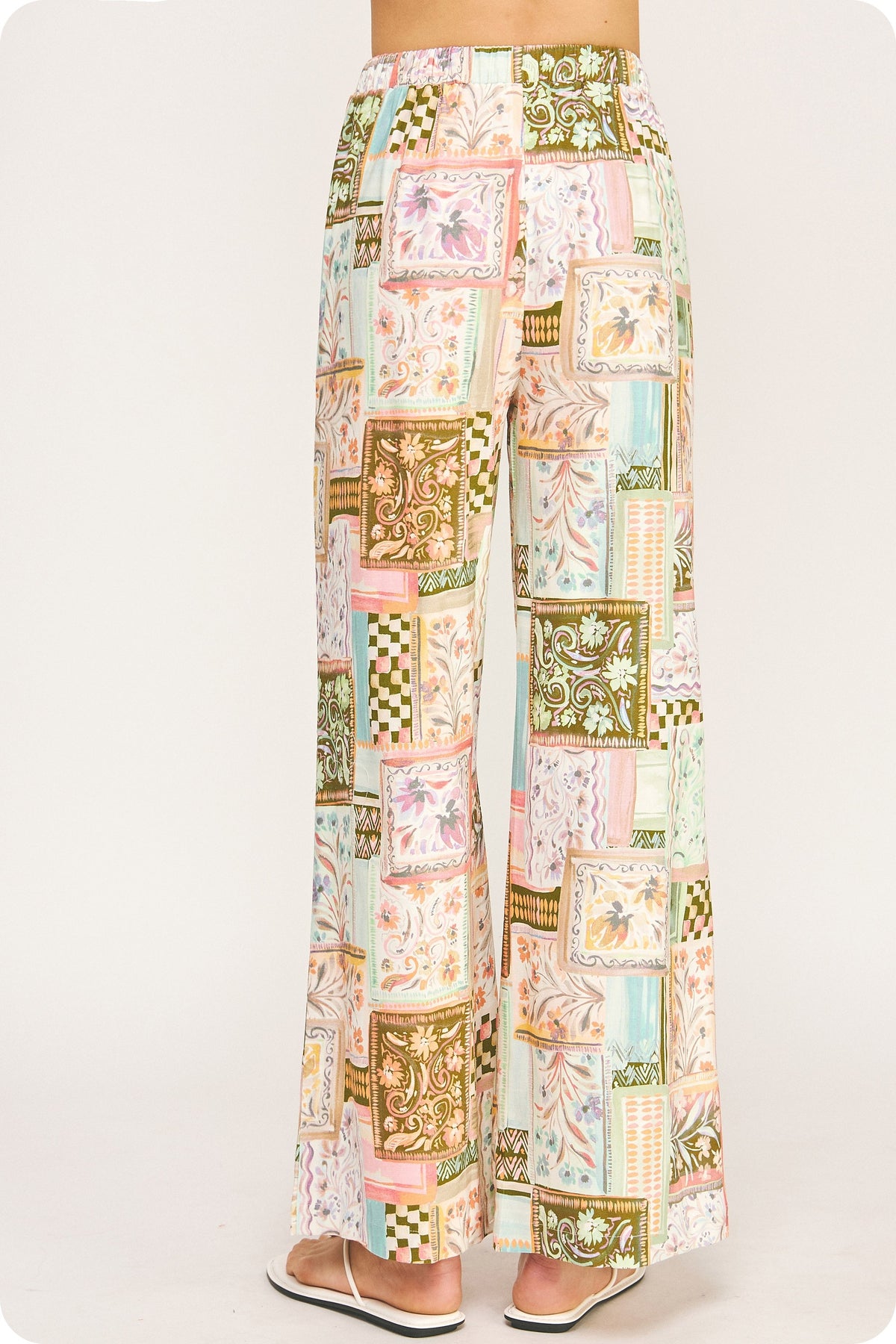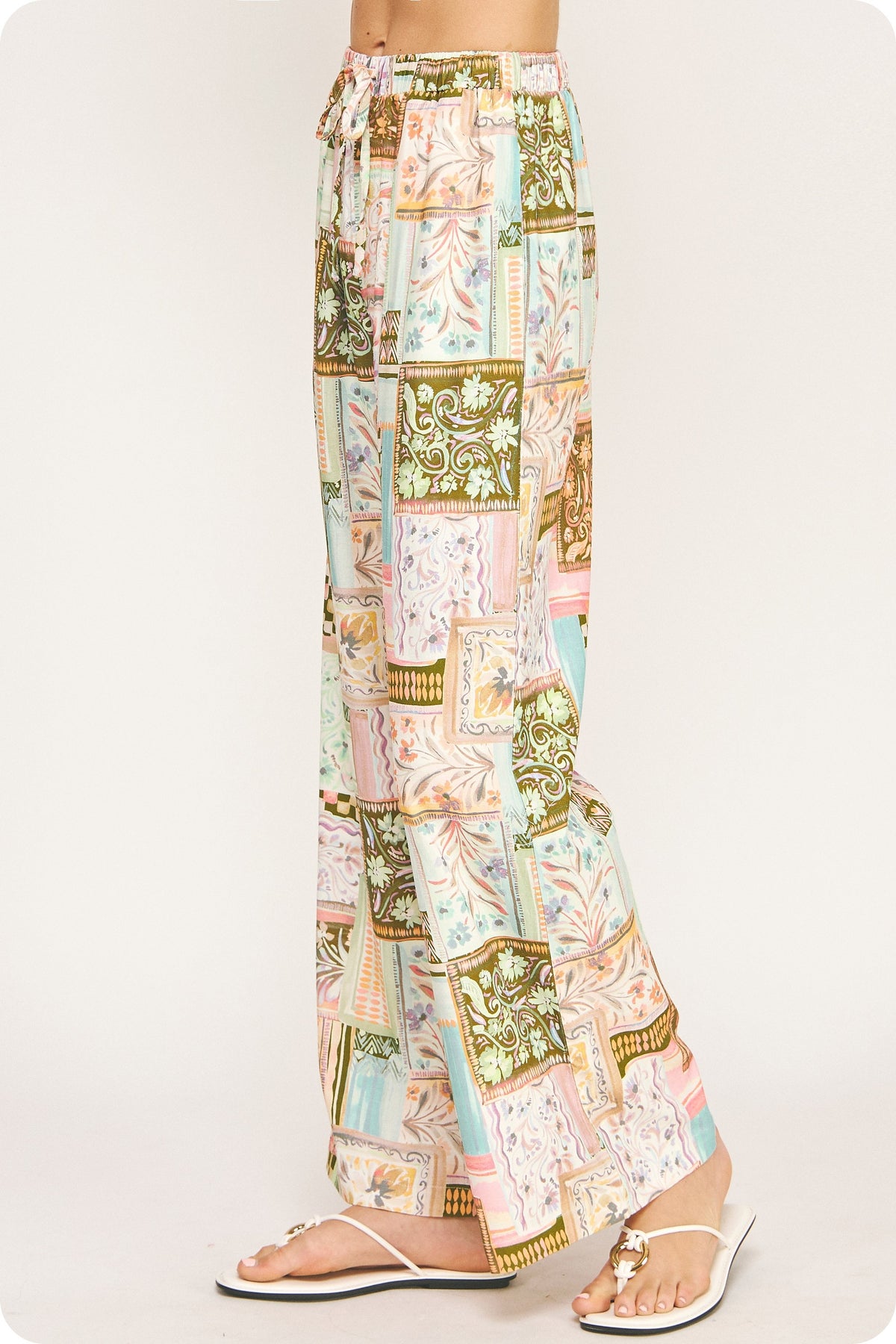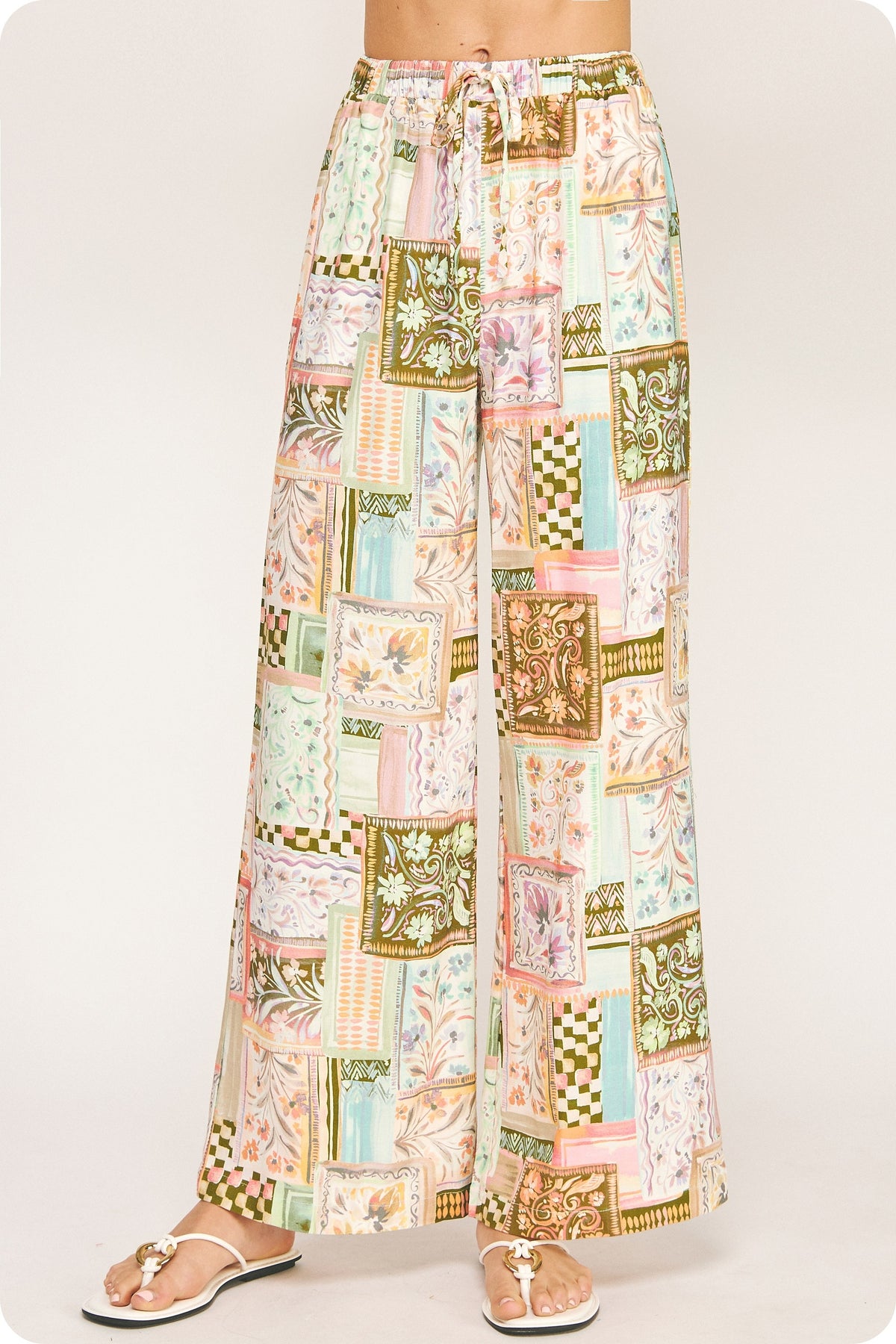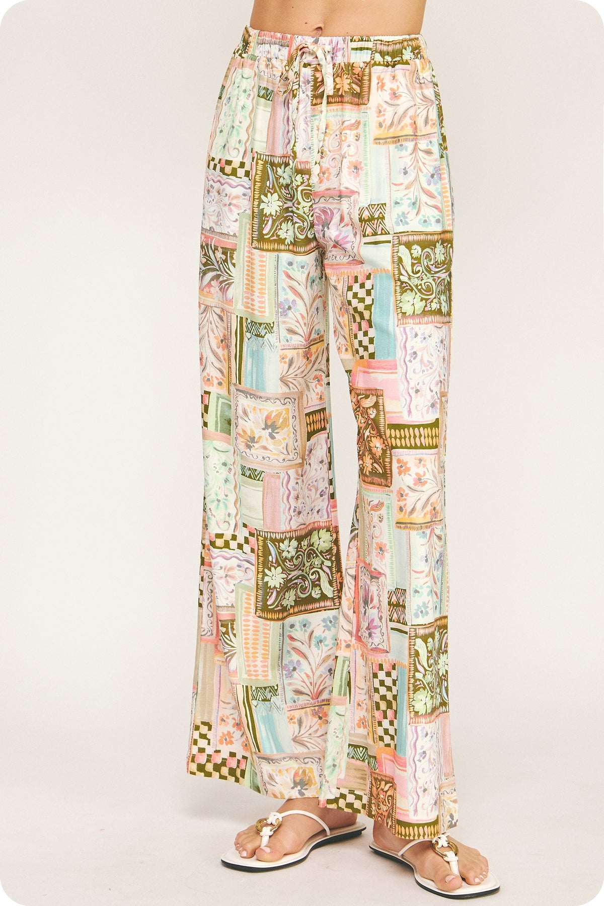 Our Ross Pant features a pretty patchwork print, drawstring waist and two slash pockets at hips. Unlined. Styled with our Presley Top and Snooze Raffia Heel.