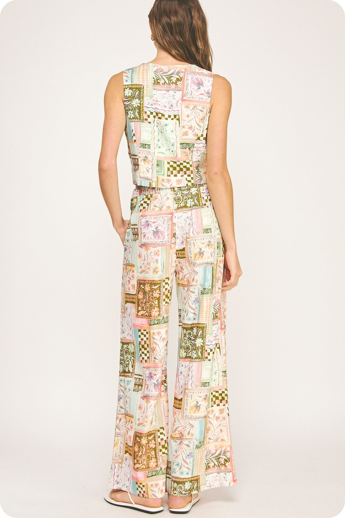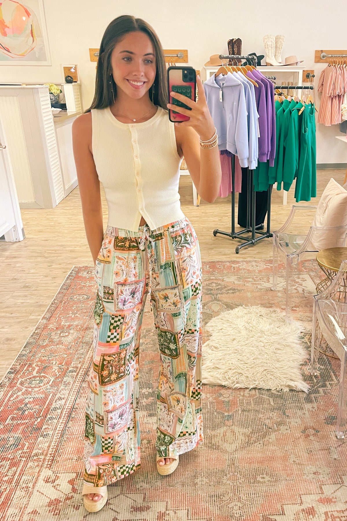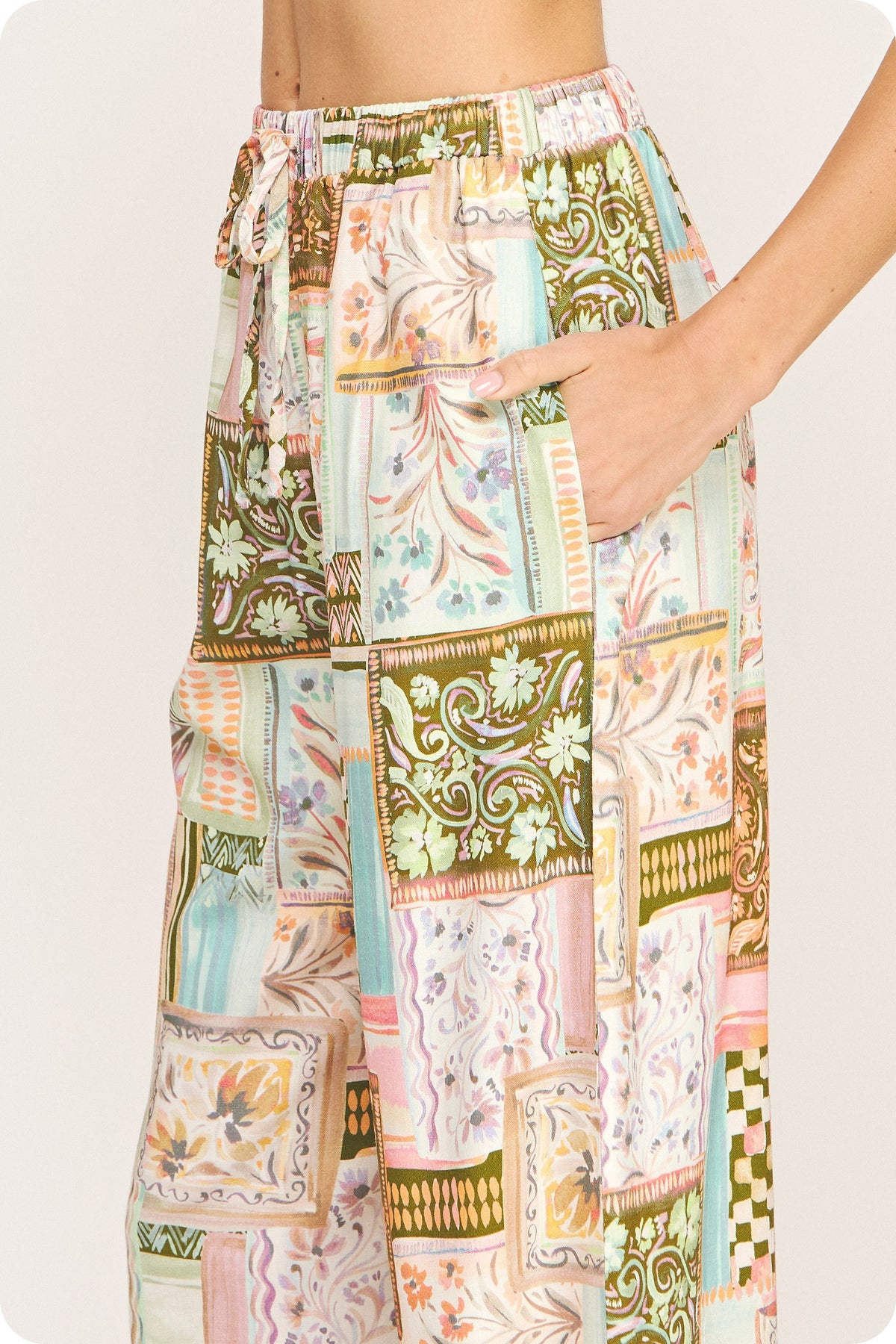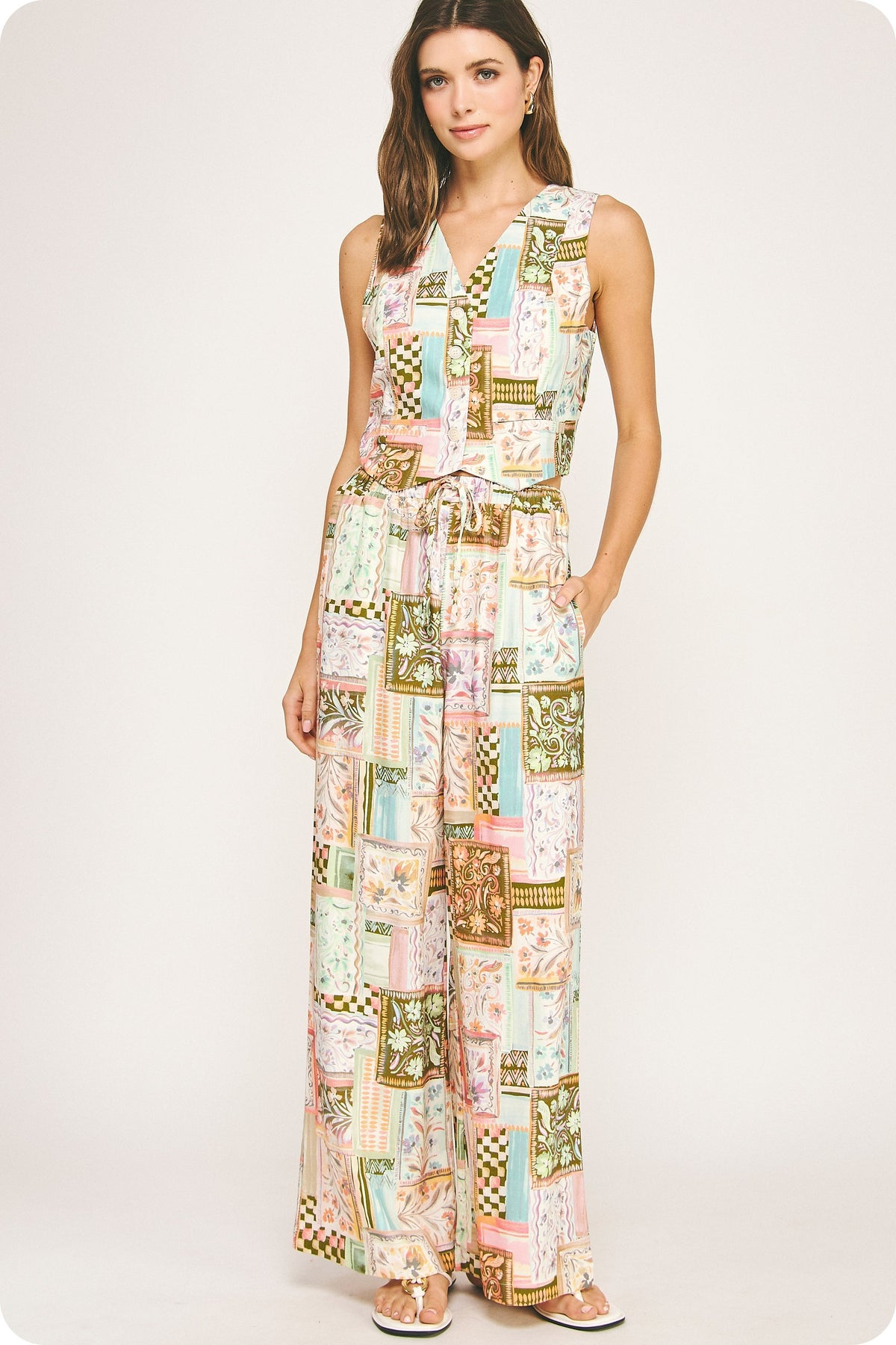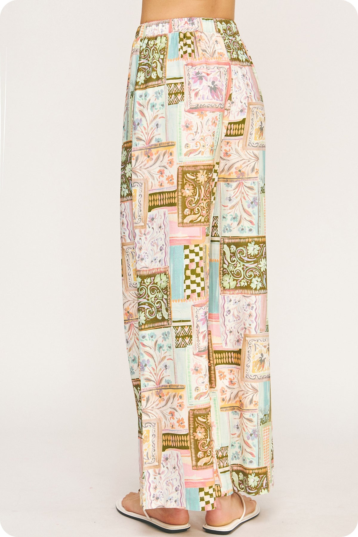 Our Ross Pant features a pretty patchwork print, drawstring waist and two slash pockets at hips. Unlined. Styled with our Presley Top and Snooze Raffia Heel.
