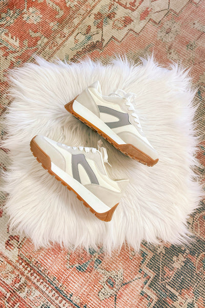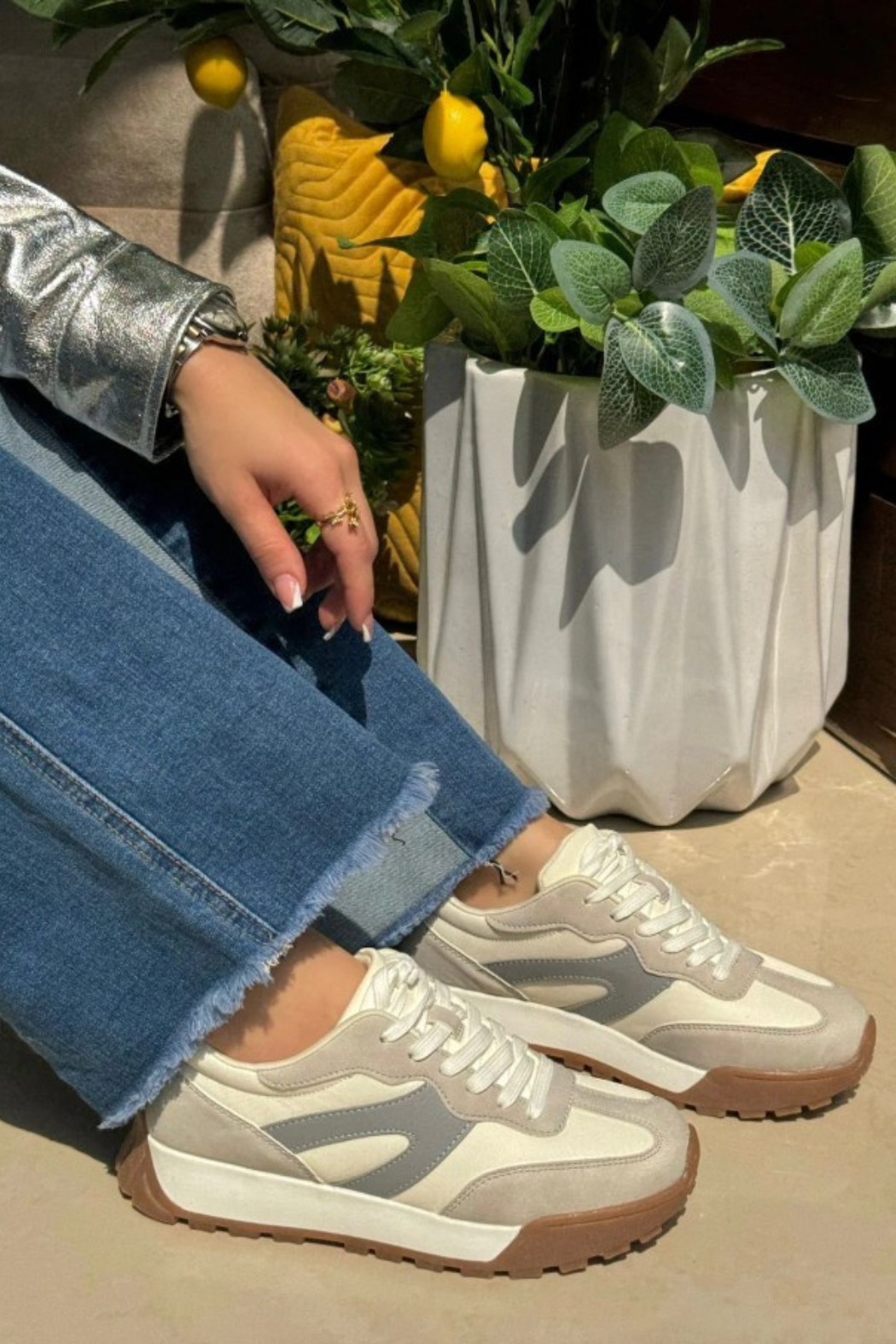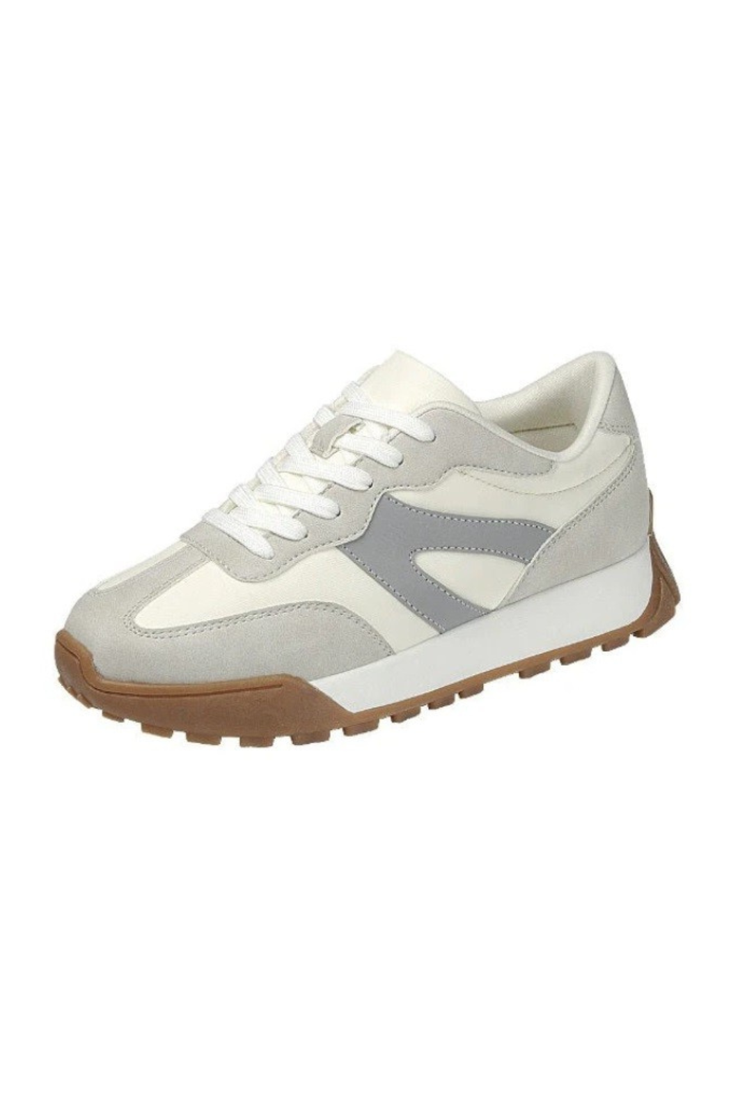 Neutral sporty sneaker featuring a platform sole. Mixed materials. Available in whole and half sizes. Lace-up construction. Synthetic suede and leather accents.